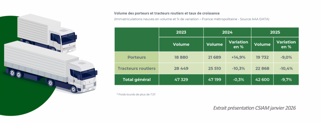 Sur le poids lourd (≥7,5 t), le marché retombe à 42 600 immatriculations en 2025 (-9,9%). Le support CSIAM décrit une première partie d’année en retrait, puis une reprise de commandes au second semestre, dans un contexte où le renouvellement de flottes reste le principal moteur. Dit autrement : on achète d’abord pour remplacer, plus difficilement pour croître.