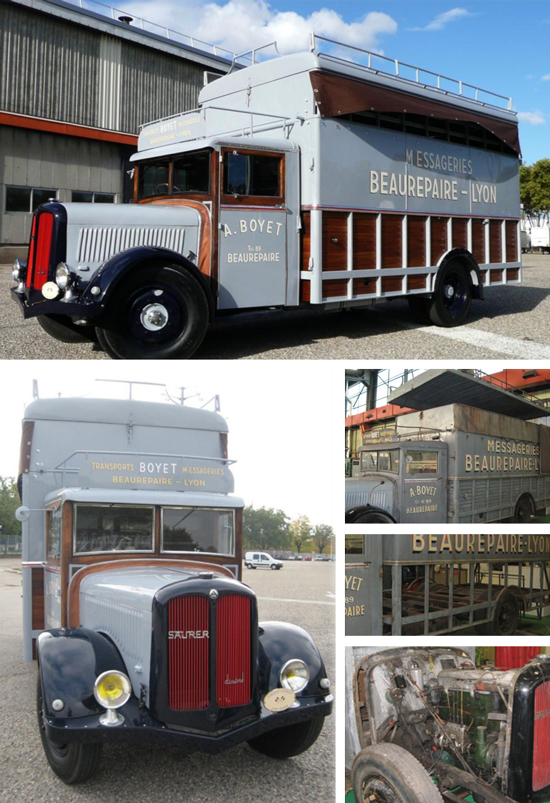 Ce magnifique camion est né en 1936 à la succursale Saurer de Lyon, 252 cours Gambetta. Acheté par les Transports Boyet de Beaurepaire (Isère), il effectue un service de messageries entre cette localité du Nord-Dauphiné et Lyon (65 km). Réquisitionné par l’Armée française en août 1939, il est restitué à son propriétaire un an plus tard à Fréjus.